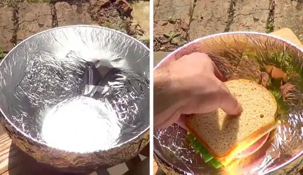 Чтобы разогреть на природе бутерброд, оберните миску фольгой и поставьте ее на солнечное место. Сыр расплавится, а хлеб приобретет легкую корочку.