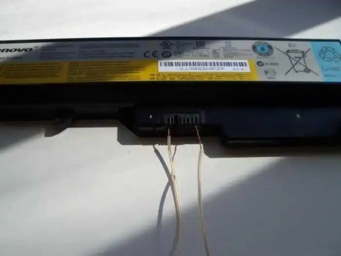 Данный метод используется исключительно для литиевых батарей. Вернуть к жизни аккумулятор может подача максимального напряжения. Понадобится зажим, тонкий провод и зарядное устройство ноутбука (или блок питания). Прежде, чем браться за операцию, следует надеть защитные очки и подготовить место работы. Вначале ищем при помощи дополнительной информации из интернета плюсовые и минусовые контакты батареи. Теперь отрезаем 2 провода по 6 см и зачистить на них покрытие длиной до 1-2 см.