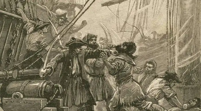 По легенде, именно Черный Барт придумал знаменитую пиратскую казнь — прогулку по доске. Обреченного пленника заставляли встать на доску, конец которой нависал над морем и уколами шпаг подталкивали его к краю. Говорят, некоторые несчастные могли продержаться на доске до двадцати минут, с ужасом глядя на акулий танец под своими ногами.