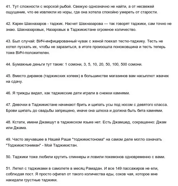 Предлагаем вашему вниманию 100 интересных фактов о Таджикистане, которые описал блогер в одной из социальных сетей. У Таджикистана нет своего собственного выхода к морю, поэтому таджики сделали свое собственное искусственное море, местные дети могут играть на улице до 11 часов вечера, девушкам лучше не гулять по городу в платье выше колен, а также много других фактов далее.