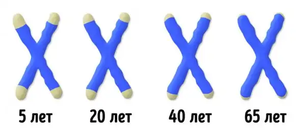 Теломеры — это участки хромосом, которые отвечают за количество делений клетки до ее уничтожения. Хотя длина теломер у каждого человека индивидуальна, рождается человек с длиной теломер 15–20 тыс. пар нуклеотидов, а умирает с длиной 5–7 тыс. Длина их постепенно уменьшается за счет процесса, называемого пределом Хейфлика, — это количество делений клеток, примерно равное 50. После этого в клетках начинается процесс старения. В ходе исследований выяснили, что ДНК может восстанавливаться за счет фермента теломераза, который взаимодействует с теломерами и «возвращает» их изначальную длину.