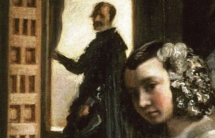 Несмотря на то что Веласкес был придворным художником короля, это был очень смелый шаг — нарисовать самого себя в «Менинах». Слева с кистью в руке изображен сам художник.