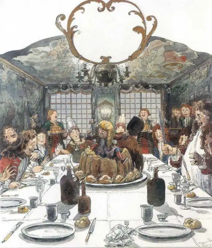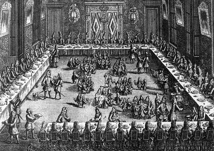 «У иного были коротенькие ножки и высокий горб, у другого — большое брюхо, у третьего-ноги кривые и вывернутые, как у барской собаки, или огромная голова, или кривой рот и длинные уши, или маленькие глазки и расплывшее от жира лицо и так далее…» Стот ли говорить, что алкоголь лился на этом празднестве рекой, и царь лично следил, чтобы молодым наливали достаточно, чтобы те опьянели.