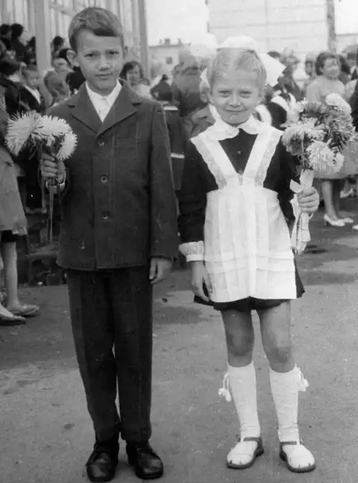 Форма, которую ввели в 1948 году, мало отличалась от гимназической. Те же воротнички, манжеты и фартуки для девочек и строгие курточки для мальчишек. Частичная демократизация мужского костюма произошла только в 1960-е годы, тогда отменили фуражки с кокардой и пояса с массивными пряжками. Правда, внешний вид строгой мальчишеской формы все равно наводил на мысли о том, что подрастающее поколение готовили исключительно к дальнейшему служению отечеству.