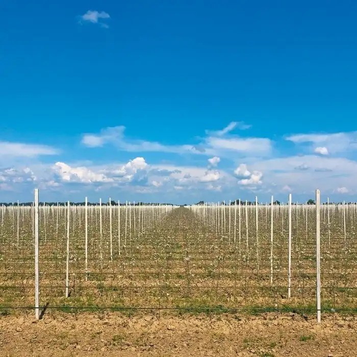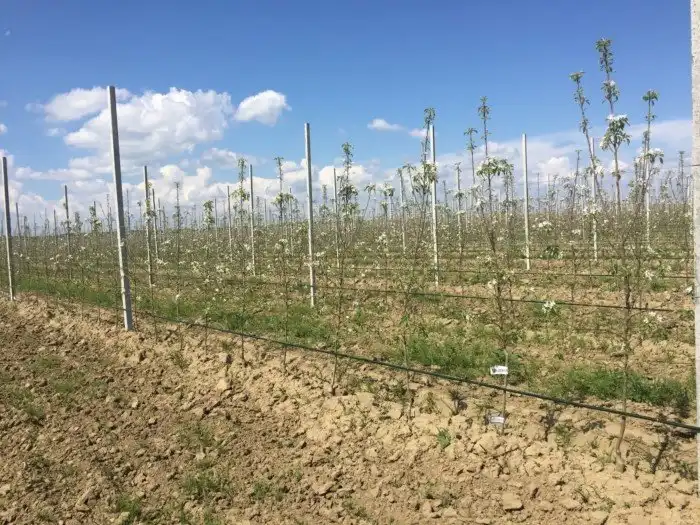 Установка опорных конструкций – шпалеры – на глубину 0,8 м для надёжной поддержки карликовых подвоев. Между бетонными столбами в каждом ряду натягиваются стальные тросы, чтобы привязать к ним хрупкие деревца в нескольких местах. Такие деревья просто не способны выдержать свой урожай самостоятельно.