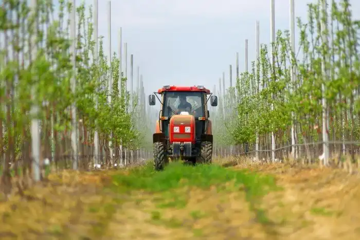 Работы в междурядьях производятся с помощью вот таких тракторов. Навесное оборудование – на все случаи жизни.