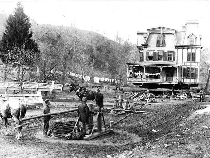 Подобное передвижение домов по континенту в Америке стало популярным в конце XIX века. Тогда можно было увидеть не только переезжающие семьи из одного края в другой, но и пустые дома, часто новые, едущие к своим новым владельцам. Так, например, богатый житель Филадельфии по фамилии Додж решил однажды, что вот тот дом, на другом берегу залива будет лучше всего смотреть вот на этом вот живописном участке — и дом сначала «поплыл» на плоту по воде, а затем лошади доставили его на необходимое место.