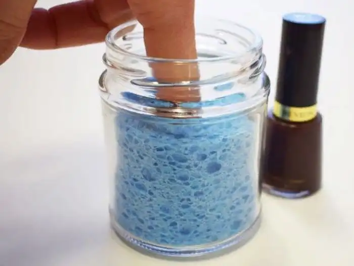Вы когда-либо пробовали снимать лак с помощью баночки? Это гораздо удобнее, чем использование ватных дисков. Вам необходимо просто разместить в баночке губку и смочить ее жидкостью для снятия лака. Когда вы закончите процедуру, не забудьте все закрыть крышкой, чтобы губка не высыхала.