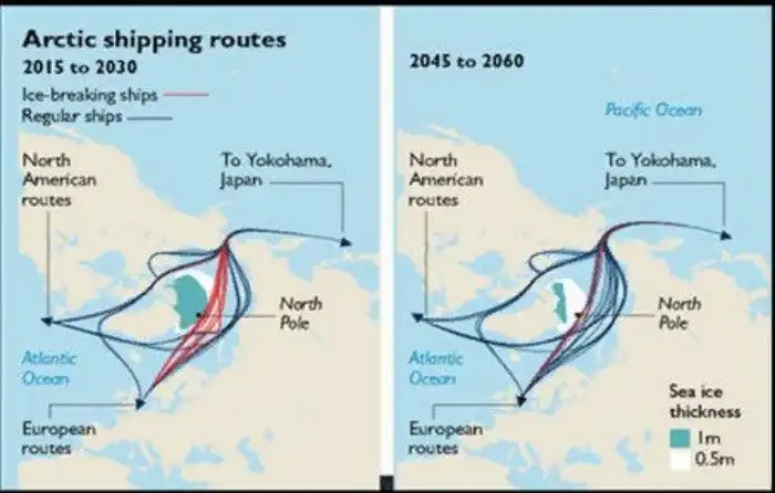 Благодаря глобальному потеплению открылись новые торговые пути через Северный полюс. Как ни парадоксально, эти маршруты могут помочь нам сократить выбросы углекислого газа, т.к. суда, которые курсируют между Европой и Азией теперь потребляют меньше топлива.
