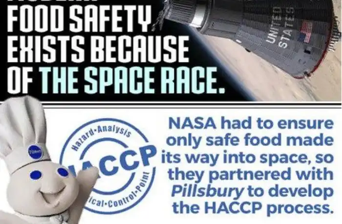 Космическую гонку вооружений мы должны благодарить за безопасность пищевой продукции. НАСА должно было обеспечить астронавтов безопасной едой, и они совместно с компанией Пиллсбери разработали систему ХACCП (систему качества управления безопасностью пищевых продуктов). Метод проверки качества был принят добровольно большинством компаний, которые занимаются переработкой и продажей продуктов питания.