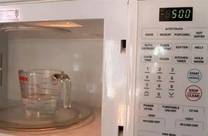 Поставьте стакан с водой и уксусом в микроволновку и включите ее на полную мощность на 2 минуты. Все!