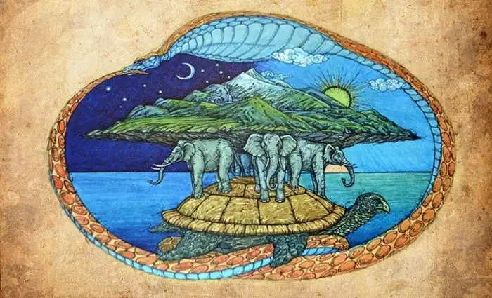 Индийцы представляли Землю в виде полусферы, опирающейся на огромных слонов. Слоны стоят на гигантской черепахе, которая расположена на свернувшейся кольцом змее, замыкающей пространство и олицетворяющей собой небо. Позднее этот образ использовал писатель-фантаст Терри Пратчетт, описывая свой знаменитый «Плоский мир».
