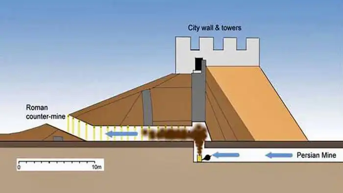 В 1933 году археолог Роберт дю Мениль дю Бюиссон проводил раскопки под местом сражения римлян и персов. Он нашел осадные туннели, прорытые под городом, в которых обнаружились останки 19 римских солдат, погибших при попытке отчаянно бежать от чего-то, а также персидского солдата, сжимающего свою грудь. Очевидно, когда римляне услышали, что персы копают под их стенами туннель, они начали рыть землю им навстречу, чтобы атаковать персов сверху. Но персы установили ловушки в своем туннеле, и поэтому когда римляне атаковали, то их встретила в туннеле горящие сера и битум, который превращается в кислоту в легких.