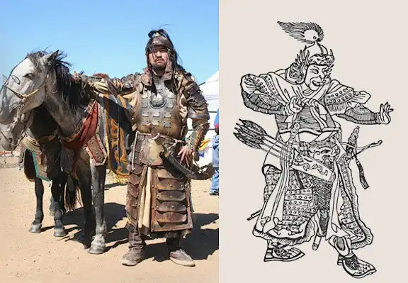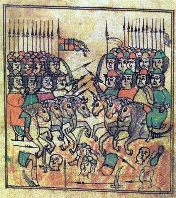 битва русских с монголами, примечательно что и одни и другие одинаковы.