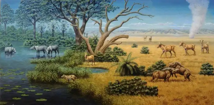 В этот период фауна млекопитающих максимально приближается к нашим дням. Древние отряды животных вымирают, появляются те, что дожили до наших дней. Растительный мир также меняется – тропических лесов становится меньше, им на смену приходятся лиственные леса.