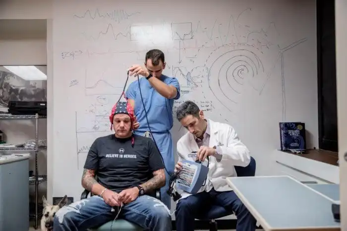 На Майке оборудование для снятия ЭЭГ. Рядом собака Олив, вместе с которой он проходит терапию.