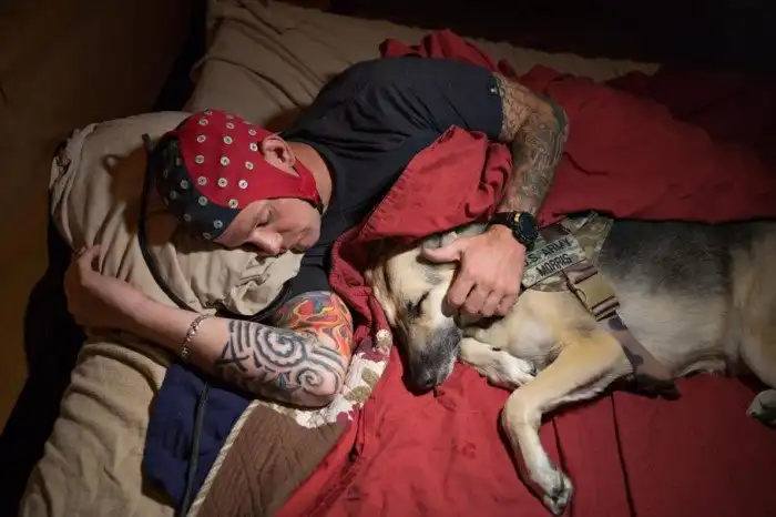 Ветеран армии Майк Моррис, дважды служивший в Ираке, участвует в эксперименте Джеффри Элленбогена из института Джона Хопкинса (справа). Изучается, каким образом домашние питомцы и воспроизводимые во время сна звуки влияют на восстановление после травмы.
