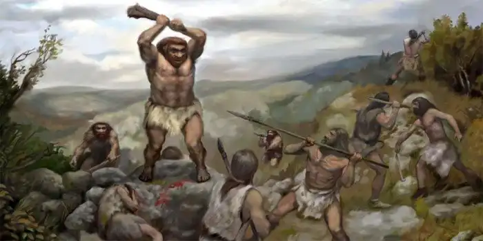 Современная фантазия художника на тему войны кроманьонцев и неандертальцев