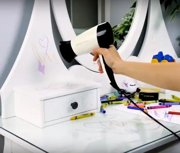 Обычно маркер на мебели оборачивается катастрофой. Избежать проблемы по замене поможет простой способ. Чтобы маркер легко стирался с помощью влажной тряпки, его нужно предварительно подогреть. Все цветные линии прогреваем горячим воздухом из фена, а потом стираем без особых усилий.