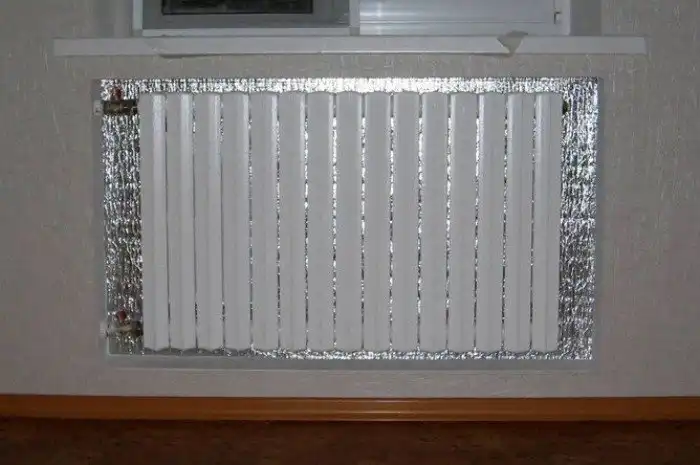 Чтобы батареи полностью отдавали тепло, не советуем закрывать их декоративными панелями. А вот от холодной стены батарею нужно отгородить, чтобы все тепло шло непосредственно в помещение. Отражатель можно сделать своими руками. Скрепить лист картона с фольгой и поместить за батареей.