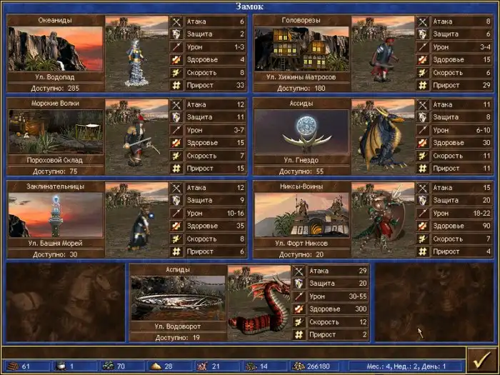 Начнём по порядку:1 уровень – океаниды (или водные нимфы). Откровенно слабоватый юнит. Очень напоминают фей из Конфлюкса, только в отличие от них, океаниды не имеют безответного удара. Как следствие, из-за низких показателей здоровья очень быстро гибнут. Особым приростом юнит также похвастаться не может. Океаниды не летают, но обладают похожей способностью. Во время перемещения они превращаются в лужу воды, которая «телепортируется» в пределах 8 клеток, в том числе и за стену замка. Однако штурмовать столь хилыми юнитами защищённую цитадель, в то время как собратья по оружию ещё не успели сломать стену или опустить подъёмный мост, дело заведомо проигрышное.