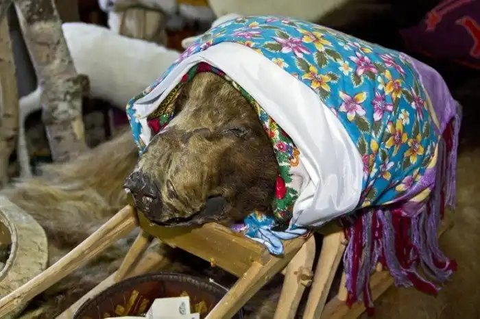 Почётное место в верованиях уральских народов занимает медведь. Если во время охоты зверя убивали, то в честь этого события устраивали большой пир, с ритуальными действами – прощание с медведем. Если же косолапый нападал и убивал человека, то пощады ему не было.
