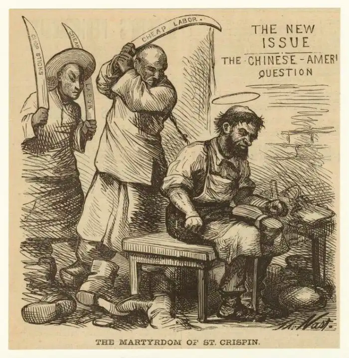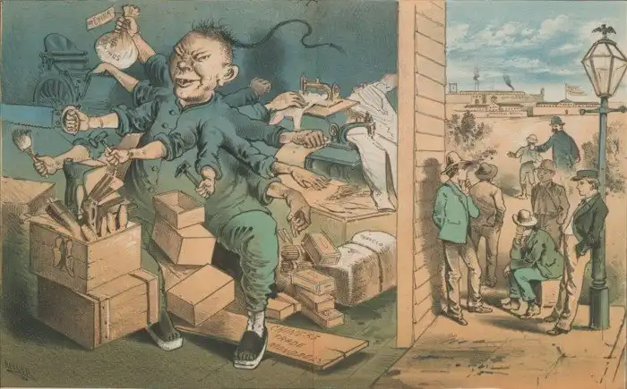 Туманные обещания сказочной прибыли быстро наложились на опиумные войны и кризис династии Цин в Китае, что быстро привело к тому, что огромное количество свободных рабочих мест заполняли китайские “кули” - чернорабочие прибывающие из поднебесной на паромах, где билеты для них зачастую продавали в кредит под обещание работать в определённой компании. Нещадно эксплуатируемые китайцы, обираемые местными чиновниками, бандитами и нечестными работодателями, стали быстро объединяться в коммуны со своим собственным управлением, охраной и адвокатами. Всё это было призвано восстановить баланс в правах между мигрантами, которые работали над главными капиталистическими стройками в 2-3 поколениях и всё ещё не имели гражданства, и коренными американо-европейцами, имевшими куда больше демократичной демократии за своей спиной, благодаря Акту об исключении китайцев, принятому в конгрессе США в 1882 году, и закону о Натурализации от 1870 года, запрещавшему иметь китайским гражданам землю на территории Штатов.