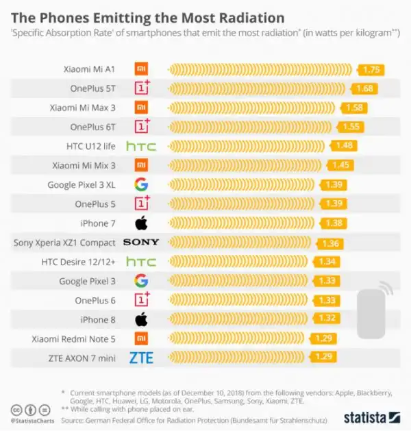 На основе всех этих данных эксперты из аналитической компании «Statista» подготовили рейтинг из 16 наиболее популярных моделей смартфонов. Цифры получились действительно интересными. Оказалось, что самым вредным может считаться Xiaomi Mi A1 – у этого смартфона наиболее высокий SAR – 1.73 ватт на кг. На втором месте с показателем 1.63 ватт на кг оказался OnePlus 5T, а на третьем - Xiaomi Mi Max 3 – 1.58 ватт на кг.