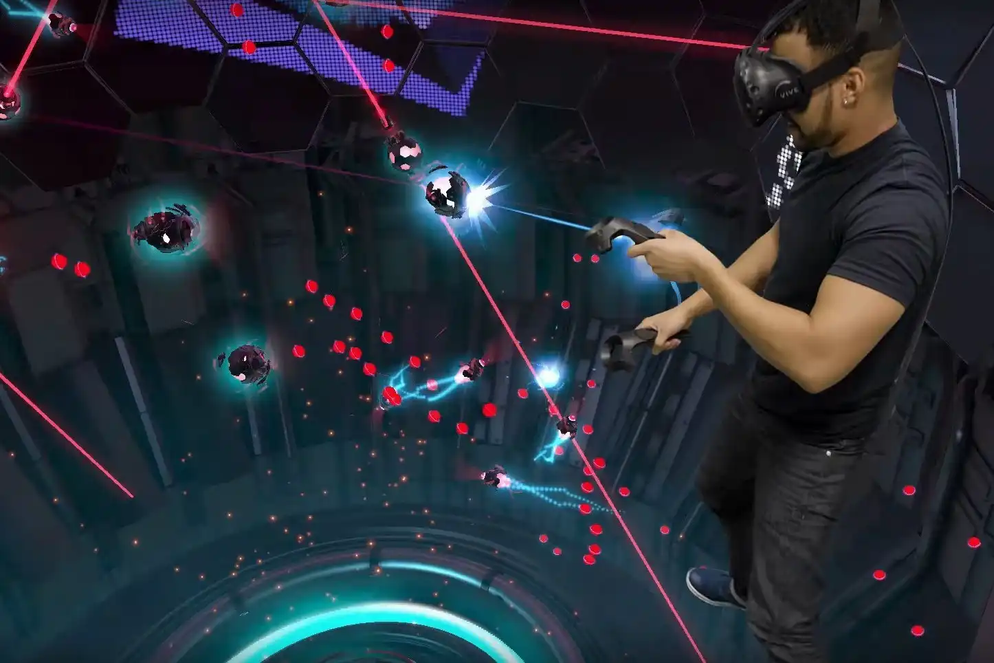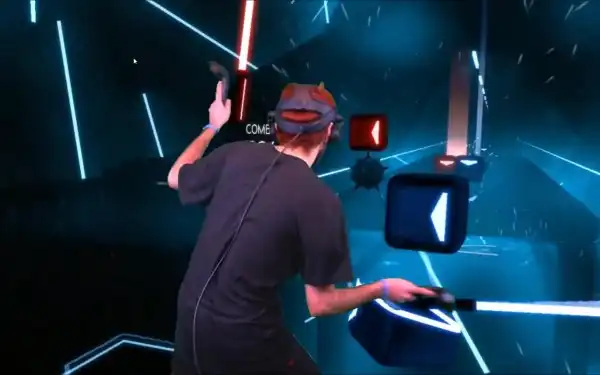 Это музыкальная ритм-игра. Под выбранную музыку на игрока летят красные и синие кубы, с нарисованной на них стрелкой, у игрока в каждой руке по световому мечу, красный и синий, нужно разрубать ими кубы, в направлении, указанным стрелкой на кубе. Помимо этого нужно уворачиваться от красных стен и стараться не разрубать бомбы. Динамичная и весёлая игра. На игру можно накатить мод и тогда станет доступен огромный каталог музыки разных жанров и исполнителей. Частенько играем с друзьями.