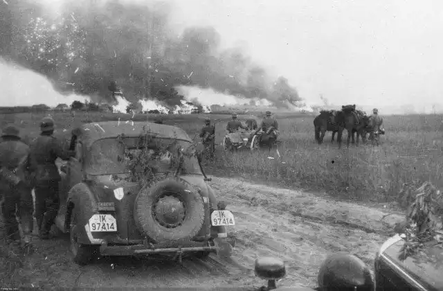 Степь,дорога непонятно куда,и тут вдруг видят столб пыли в степи. Тормозят. Бинокль к глазам -немецкая танковая колонна. Прёт -как у себя дома - нагло,как на параде,над башенными люками холёные морды фрицев.