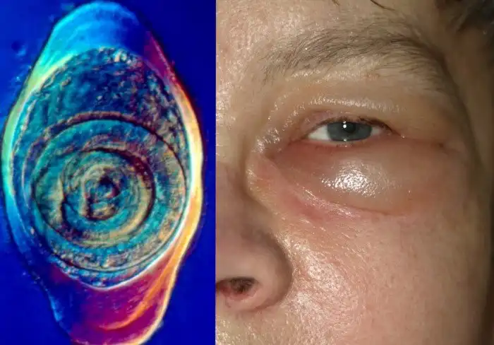 Позднее, дней через 10 минимум вас ждёт стадия диссеминации: в зависимости от типа случайных миграций можно испытать головные боли, лихорадку, озноб, кашель, боли в мышцах. Но связать их с употреблением свинины или другого мяса будет всё сложнее из-за возрастающего временного промежутка между попаданием паразита в организм и вашими симптомами. Возможны аллергеческие высыпания, отеки лица, сыпь, зуд, температура. Это червячки расползаются и вызывают аллергию. В большинстве мест ваш организм успешно их атакует, и они умирают. Но если вам не повезло, и засранцы забрались в дыхательную, сердечно-сосудистую, центральную нервные системы, их смерть может оказаться фатальной и для вас, вызвав тяжелые поражения органов, как, например, паралич дыхательных путей. А ещё они могут, например, мигрировать в мышцы глаза, что сопровождается отеком, экзофтальмом и птозом.