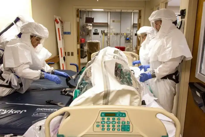 А так сегодня выглядят медсестры, чья деятельность соприкасается с вирусом Эболы и требует мер 4 уровня биозащиты.