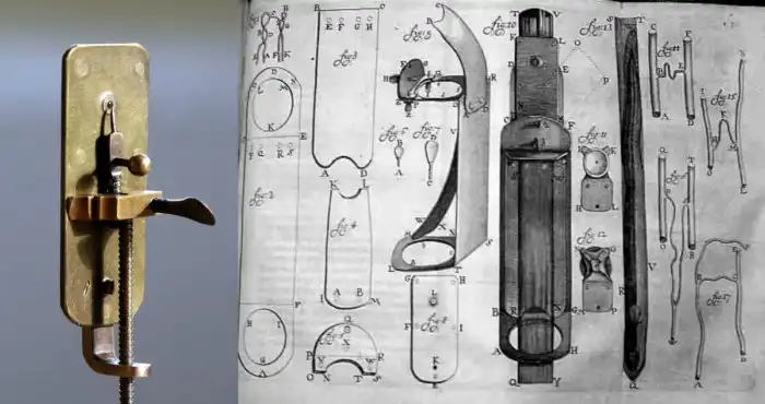 Первый микроскоп Левенгука сделан по принципу замочной скважины: через крохотную линзу с обратной стороны пластины смотрели на свет, два штатива были для удержания и фокуса: