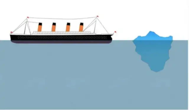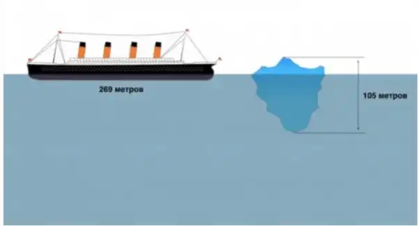 Если быть точным, высота айсберга составляла всего 100 с лишним метров. Это в 2,5 раза меньше, чем длина «Титаника». И почти вся масса льда, как это и бывает, скрывалась под водой.