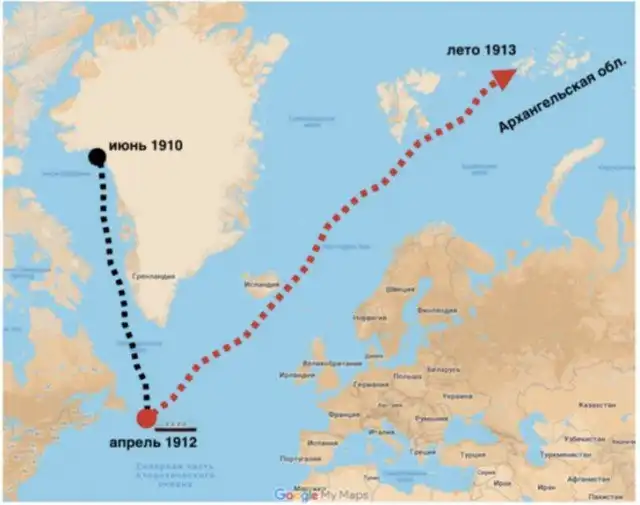 Примерно в июне 1910 года он отломился от ледяного панциря и отправился в свободное путешествие по арктическим морям. Больше двух лет ему понадобилось, чтобы добраться до места столкновения.