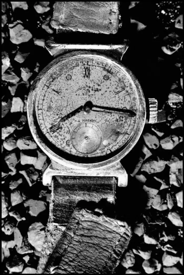 Их стрелки также показывают 8:15, однако обгоревшими они не выглядят (у часов на последней фотографии даже кожаный ремешок цел). Следовательно, они находились поодаль от эпицентра взрыва, либо были защищены от светового излучения каким-то предметом (находились в здании, например). Здесь проявляется действие ударной волны, которая уничтожала и разрушала все, что попадалось ей на пути.