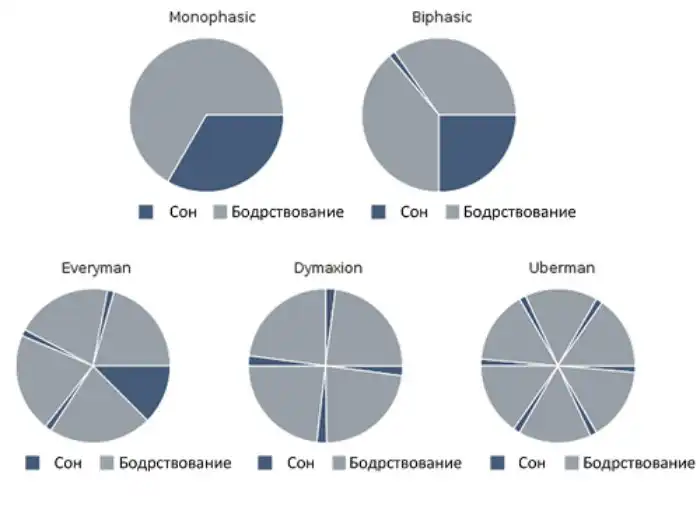 Принцип такого сна заключается в делении сна на небольшие промежутки от 30 минут до 1:30. Из-за чего время бодрствования равняется 20 – 22 часам. Адепты данного явления утверждают, что прекрасно себя чувствуют, и всё успевают. Ведь их секрет заключается в исключении фазы медленного сна. Но для подобных манипуляций нужны долгие и упорные тренировки.