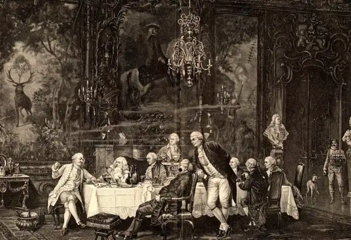 Мюнхгаузен рассказывает о своих приключениях. Гравюра на дереве, 1889 - по живописи Винсента Столтенберга Лерхе (1837-1892). Источник изображения: akg-images.co.uk