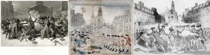 Важной является каждая деталь. Посмотрите, например, на три изображения Бостонской бойни 5 марта 1770 года. Жители колонии вступили в вооружённый конфликт с Британскими солдатами. Завязкой драки послужил спор солдата с оскорблявшим его мальчиком. Мальчика в итоге ударили прикладом, собралась толпа, и когда рядовому Монгомери камнем чуть не проломили башку, он выстрелил. А единичный выстрел восприняли как команду к залпу. На месте погибли трое, ещё двое от ран в больнице. Американские колониальные власти тут же использовали это событие, чтобы «сплотить нацию». Изначально в новости попала картина с хаотичной потасовкой, но в результате снятия пары копий и перерисовок, она быстро стала настоящим знаменем борьбы, на котором были изображены британцы, расстреливающие без суда и следствия мирное население, включая чернокожего матроса и собаку.