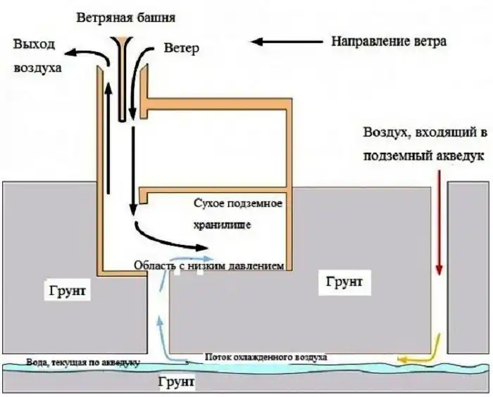 Учитывая то, что бадгиры или малькафы были огромных размеров, то их действие не ограничивалось обычными функциями вытяжки, они позволяли охладить не только воздух и стены, но и подземные хранилища воды с их многочисленными каналами практически до 0°C.