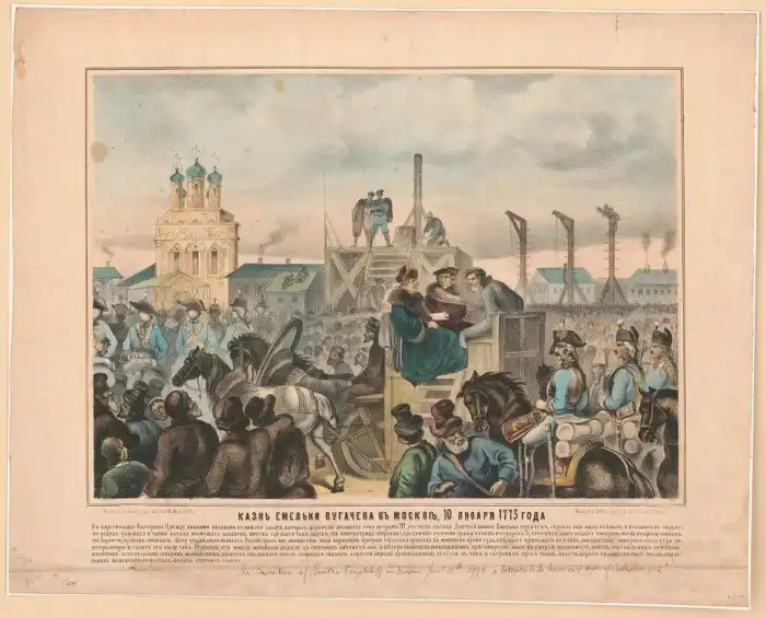 На 10 января 1775 года была назначена казнь Емельяна Пугачева. По приговору суда Пугачева должны были четвертовать, после чего отрубить голову и все чести тела развезти в разные концы города и сжечь. Такая страшная казнь была придумана самой императрицей в отместку за ее страхи и боязнь потерять престол. Но по ходу казни произошли изменения, сначала Пугачеву на Болотной площади в Москве отрубили голову, а после уже четвертовали.