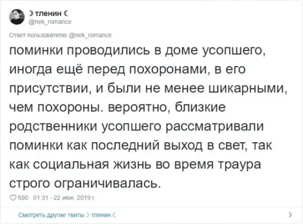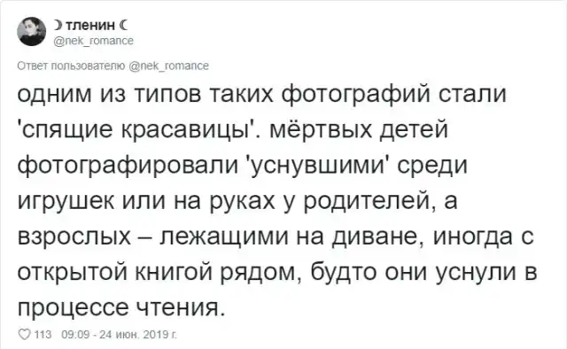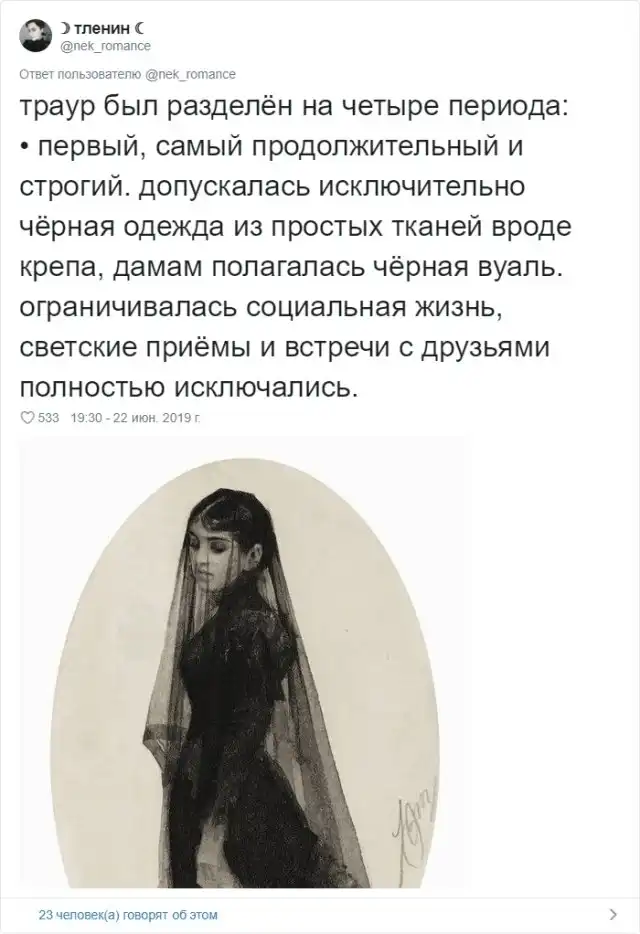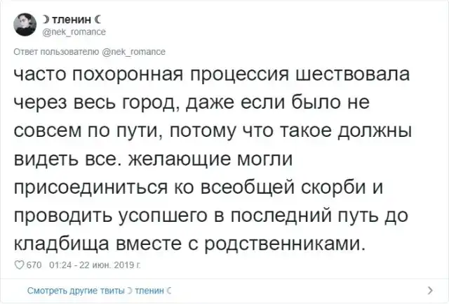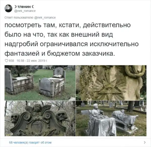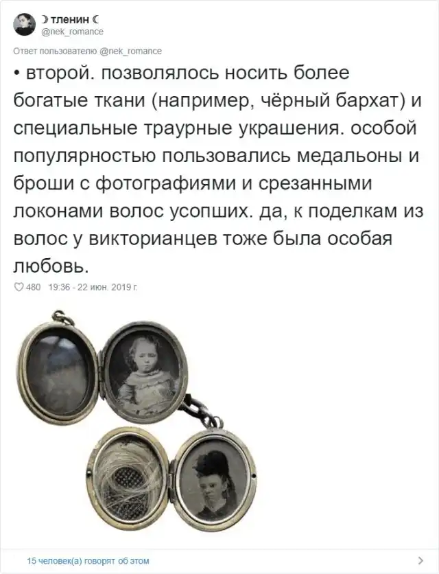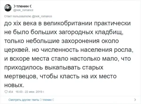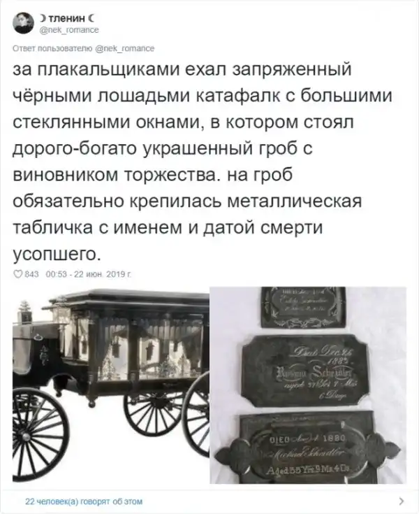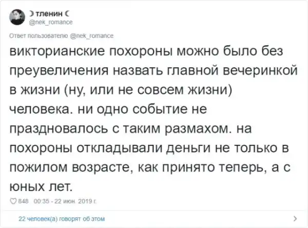 В Твиттере обсудили интересную тему. Там поговорили о культе смерти в Англии в период правление королевы Виктории: 1837-1903 годы, эту эпоху называют викторианской. Эта информация пришлась по душе читателям, и пост в социальной сети набрал немало лайков и репостов. Тема действительно очень интересная. Советую к прочтению.