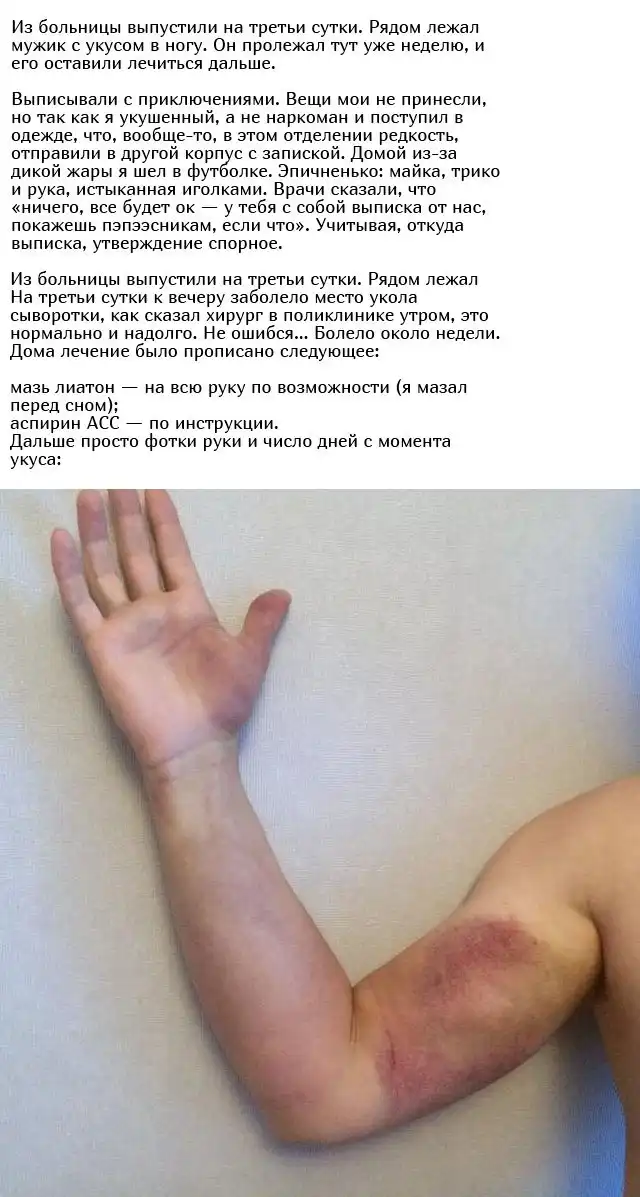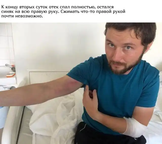 Один из пользователей Интернета поделился историей о том, как его укусила гадюка. Укус пришелся на большой палец правой руки. По его словам, укус не особо болезненный по сравнению с тем, как жалит, например, оса. Далее автор рассказывает, что с ним происходило. Аккуратно, некоторые фото могут показаться жесткими.
