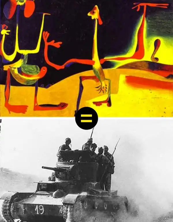 Эта картина каталонского художника Жоана Миро — одна из его 12 работ, созданных в период общественных беспорядков в Испании. На первый взгляд совершенно непонятно, что это за зловещие танцы петухоподобных чудовищ. Единственное, в глаза сразу бросаются яркие цвета, контрастирующие с чернотой апокалиптического фона, — чувствуется, что это оно выражает нечто крайне беспокойное.