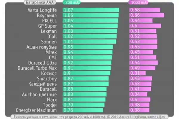 Я тестировал по несколько экземпляров многих типов батареек. В таблицу попали наименьшие результаты. У большинства батареек разница между экземплярами минимальна. Разница около 10% между экземплярами зафиксирована только у Flarx из магазинов FixPrice (0.81 и 0.94 Втч) и у безымянных цветных батареек из Ашана (0.83 и 0.91 Втч).
