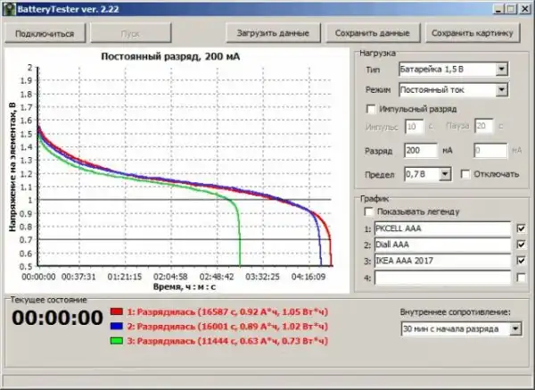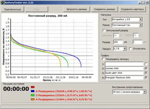Я проводил тесты с помощью анализатора батареек Олега Артамонова.