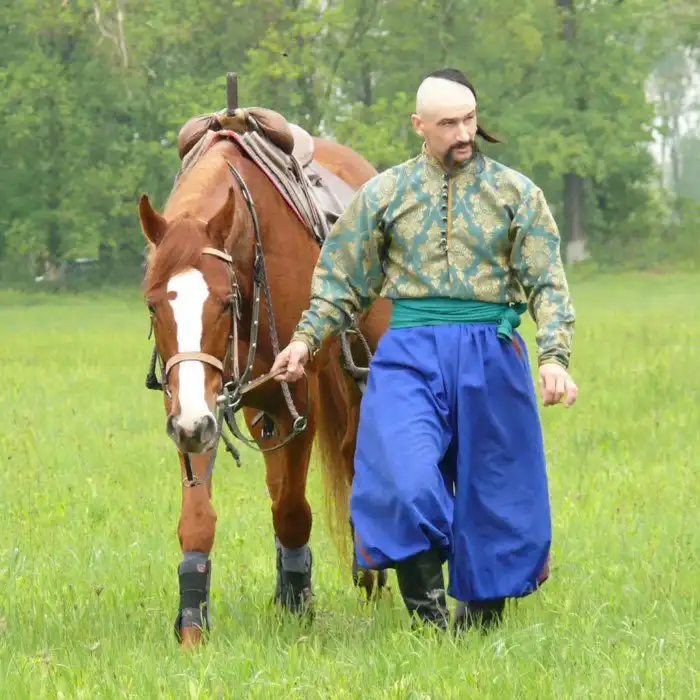 Помимо шаровар, казак облачается в жупан и рубашку-вышиванку. А посередине выбритой головы запорожца красуется длинная прядь волос – чуб. Всё это является частью канонического образа запорожского казака.