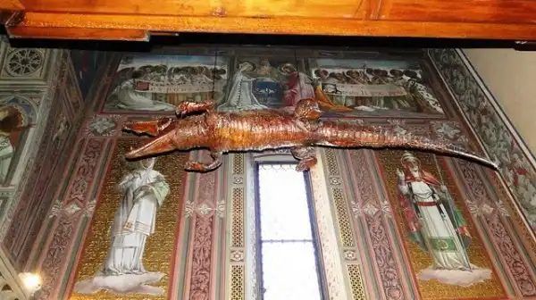 Также можно найти несколько крокодилов в Италии. Один из них находится в Святилище пресвятой девы Марии Милосердной, которое располагается в городе Куртатоне. Чучело рептилии висит под крышей храма уже 500 лет, напоминая прихожанам о том, как близки силы зла.