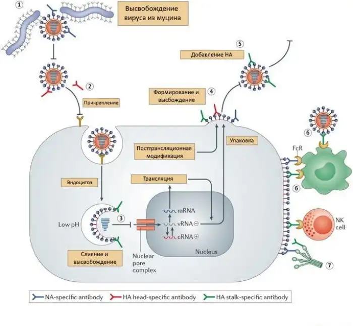 Вторая часть - Нейраминидаза (во всех аббревиатурах N) - занимается тем, что отделяет остаток N-ацетилнейраминовой кислоты от полисахаридов клеточной мембраны, тем самым разрушая рецепторы, чувствительные к вирусу на клетках организма-хозяина. В теории, это “ослепляет” фильтр и помогает вирусу проникать через клетки секрета слизистых, богатых сиаловой кислотой, туда и обратно. H - прилипало, N - вход. Два основных ключа для проникновения в клетку вирусной РНК. После вброса вредоносного кода клетка начинает работать по подставной программе и производить запчасти для новых вирионов, и вместо своего нормального функционирования запускает механизм общего заболевания.