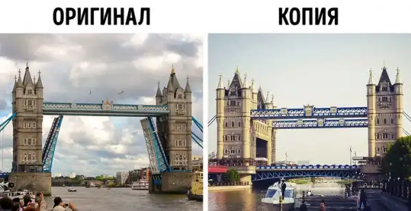 Построенный в 2012 году в городе Сучжоу, Тауэрский мост является копией знаменитой лондонской достопримечательности. Но, в отличие от оригинального сооружения, у китайского моста 4 башни, а не 2, и центральный пролет не поднимается. Каждая башня китайской копии имеет высоту 40 м, а оригинальные башни возвышаются над Темзой на 65 м. Однако несколько лет назад мост в Сучжоу был полностью реконструирован и потерял какое-либо сходство с Тауэрским.